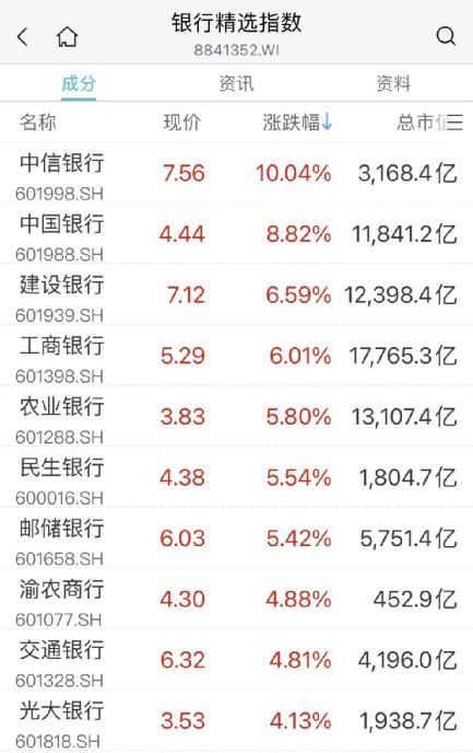 大金融板块持续拉升,银行股再度大涨,中信银行率先涨停,为2020年7月以来首次,股价直逼历史高点。