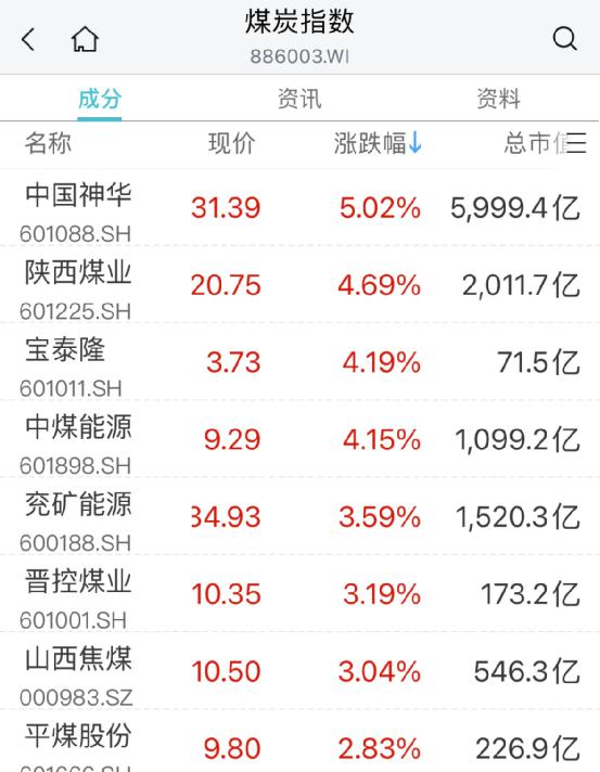 煤炭板块走强,中国神华涨超5%,陕西煤业、宝泰隆、中煤能源、晋控煤业等跟涨。