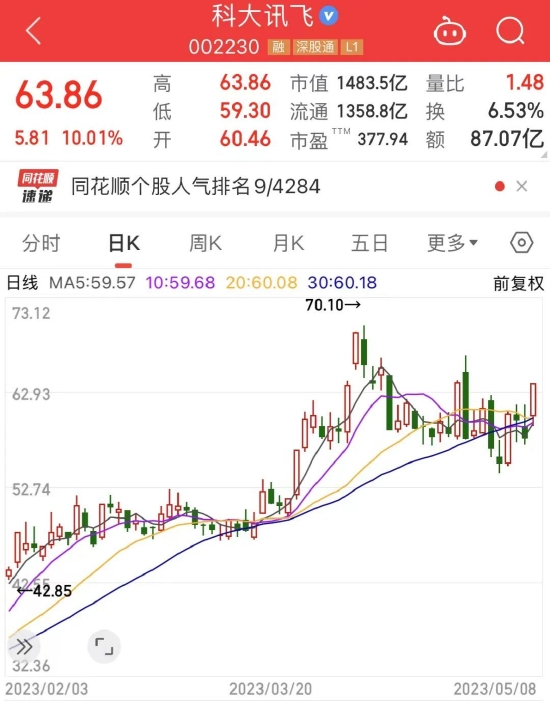 智能语音龙头科大讯飞成交87.07亿元,排在第1位,该股今日收获涨停板。消息面上,5月6日,科大讯飞发布星火认知大模型。该公司董事长表示,认知大模型成为通用人工智能的曙光,后续还将联合开发者推动大模型应用落地,共建人工智能“星火”生态。