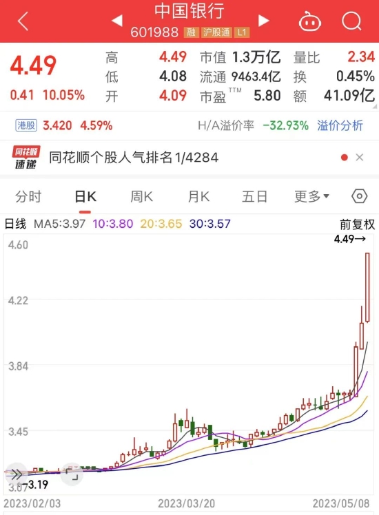 农业银行今日盘中触及3.93元/股,创历史新高,收盘涨7.46%,最新A股市值升至1.24万亿,排名全市场第4位。另一只银行巨头中国银行今日股价罕见涨停,最新A股市值9463.37亿元,排名全市场第6位。