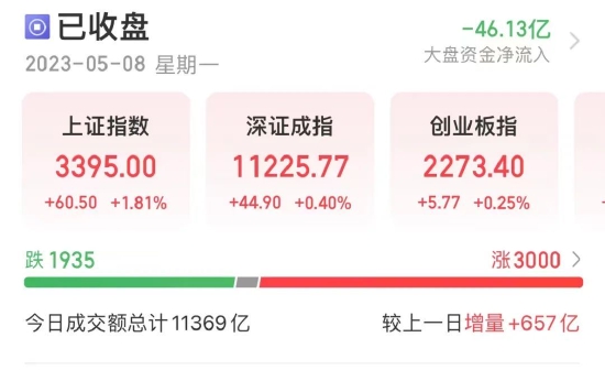 5月8日,上证指数盘中触及3400.18点,收盘涨1.81%,报收3395点。A股全天交易额达到1.14万亿,连续22个交易日成交破万亿。