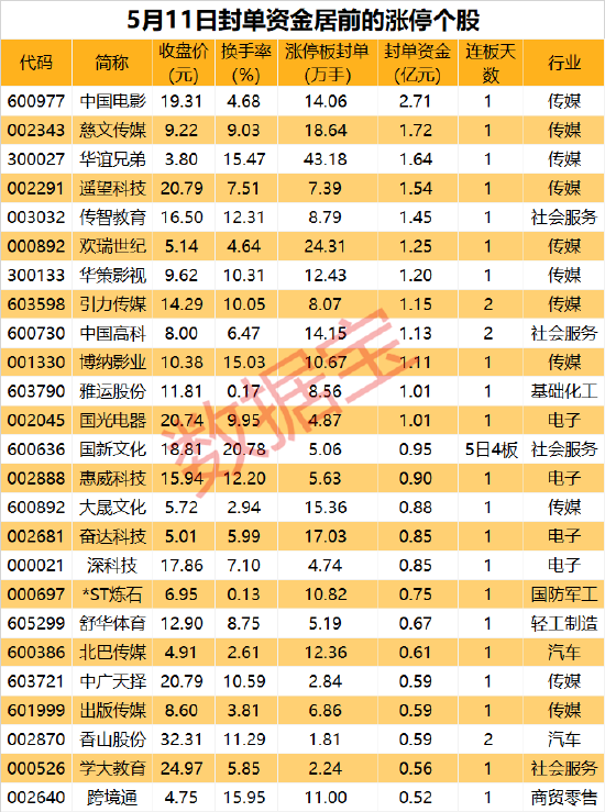 以封单金额计算,12股封单金额超亿元,其中中国电影、慈文传媒、华谊兄弟3只影视股封单金额最高,分别为2.71亿元、1.72亿元、1.64亿元。
