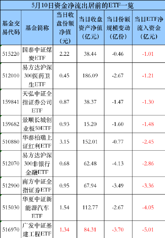 银河证券基金研究中心数据显示,5月10日当天,资金净流出超过1亿元的9只股票ETF中,有7只为行业ETF,1只为宽基ETF,1只为红利ETF。
