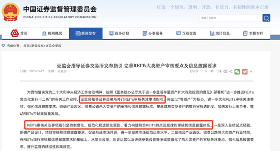 5月12日,证监会表示,为贯彻落实党的二十大和中央经济工作会议精神,按照《国务院办公厅关于进一步盘活存量资产扩大有效投资的意见》部署和“进一步推进REITs常态化发行十二条”的有关工作安排,证监会指导证券交易所修订REITs审核关注事项指引,突出以“管资产”为核心,进一步优化REITs审核关注事项,强化信息披露要求,明确产业园区、收费公路两大类资产的审核和信息披露标准,提高成熟类型资产的推荐审核透明度,加快发行上市节奏,推动REITs市场高质量发展。