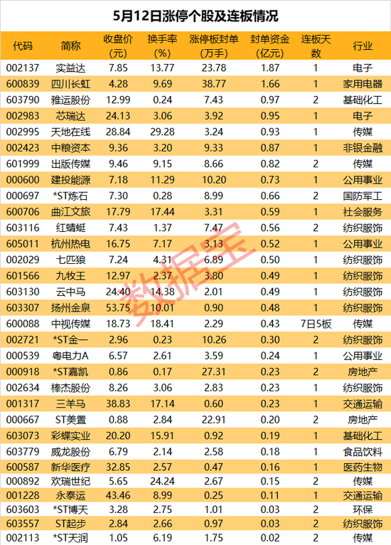 从收盘涨停板封单量来看,四川长虹封单量最高,有38.77万手;其次是*ST嘉凯、实益达,涨停板封单分别为27.31万手、23.78万手。