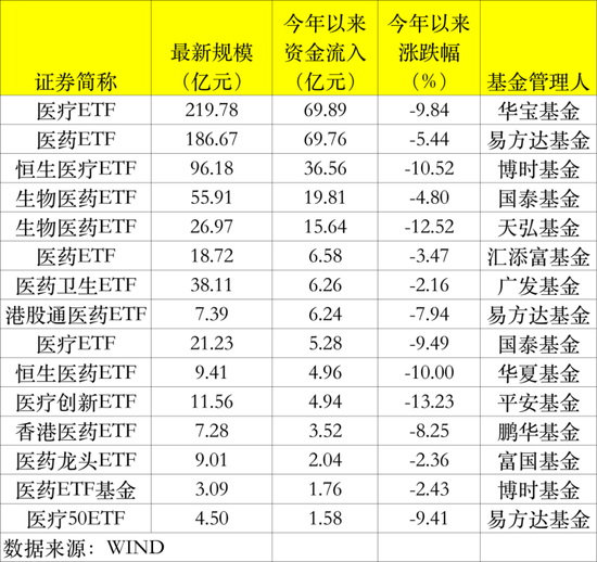 Wind数据显示,从年内基金份额变化情况来看,截至5月11日,今年以来有28只股票型ETF份额增长超过20亿份,多只医药相关ETF霸榜,比如,华宝医疗ETF年内份额增加138.34亿份,按区间成交均价计算,资金净流入近70亿元;紧随其后的是易方达医药ETF、博时恒生医疗ETF,年内份额增加143.65亿份、62.45亿份,资金净流入近70亿元、40亿元。
