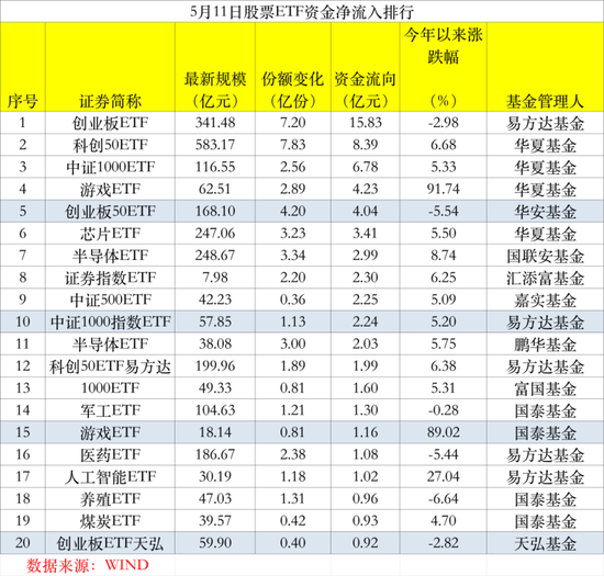从资金净流入排行看,5月11日当天收盘,创业板ETF、科创50ETF、中证1000ETF等宽基指数产品受到资金青睐,资金净流入排行居前。其中,易方达创业板ETF净流入资金15.83亿元,位居全市场首位,高位回调的华夏科创50ETF也获得8.39亿元资金的净买入,此外,华安创业板ETF资金净流入4.04亿元。