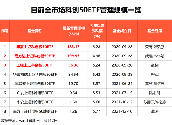而从目前全市场跟踪科创50指数的ETF产品看,华夏科创50ETF规模最大,达到583亿元,目前管理规模仅次于华泰柏瑞沪深300ETF,位居国内股票ETF市场管理规模第二名。另外,易方达、工银瑞信基金旗下科创50ETF规模分别为199.96亿元,55.36亿元,在同类型指数跟踪产品中,规模也位居前列。