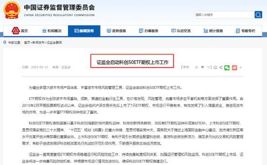 5月12日,中国证监会官网消息,为健全多层次资本市场产品体系,丰富资本市场风险管理工具,证监会启动科创50ETF期权上市工作。同一天,上交所也发布消息,将在中国证监会指导下认真做好科创50ETF期权上市相关工作。