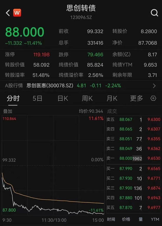 思创医惠(维权)今日跌2.24%,但思创转债却大跌11.41%,收盘价报88元/张。思创医惠发布的2022年年报被出具保留意见的审计意见,深交所近日下发问询函,要求公司就相关事项进行说明。