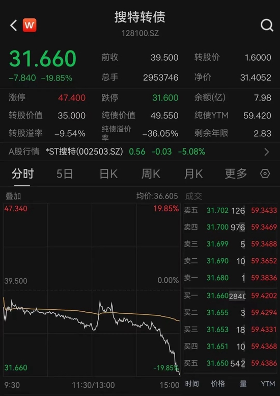 5月12日,搜特转债再跌19.85%,价格报31.66元/张,再次刷新转债市场最低价纪录。搜特转债目前债券剩余规模接近8亿元,但公司已锁定退市,并且公司业绩年年亏损,不由得让投资者担忧搜特转债的兑付问题。