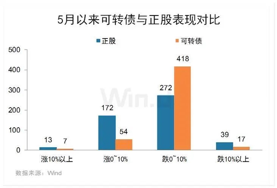 具体可转债与相应的正股对比来看:Wind数据显示,目前496只公募可转债和其正股正常交易,5月以来涨跌情况如下: