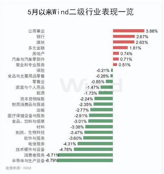 板块方面,各行业板块表现差异大。Wind数据显示,5月份以来,Wind24个二级行业,7个上涨,占比仅有25.9%,涨少跌多明显。其中公用事业、银行和媒体行业以上涨2.5%以上领先。紧随其后多元金融、房地产、汽车与汽车零部件和商业和专业服务4大行业也有所上涨。而下跌的行业中半导体、消费者服务跌幅较大,均超过6%。