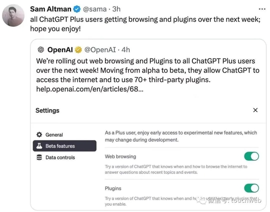 OpenAI CEO Sam Altman说,“所有ChatGPT Plus 用户将在下周获得浏览和插件;希望你喜欢!”