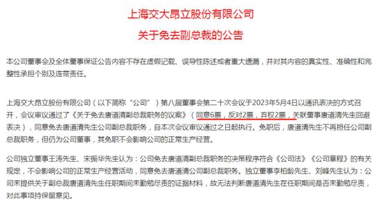 不过据公告,公司董事会投票发生了分歧,其中同意6票,反对2票,弃权2票。其中董事赵思渊直言反对的理由为公司无正当理由免除高管职务。此外,独立董事李柏龄、刘峰也表示,公司未提供关于副总裁唐道清任职期间未勤勉尽责的证据材料,故无法判断唐道清在任职期间是否未勤勉尽责,对此事项持保留意见。