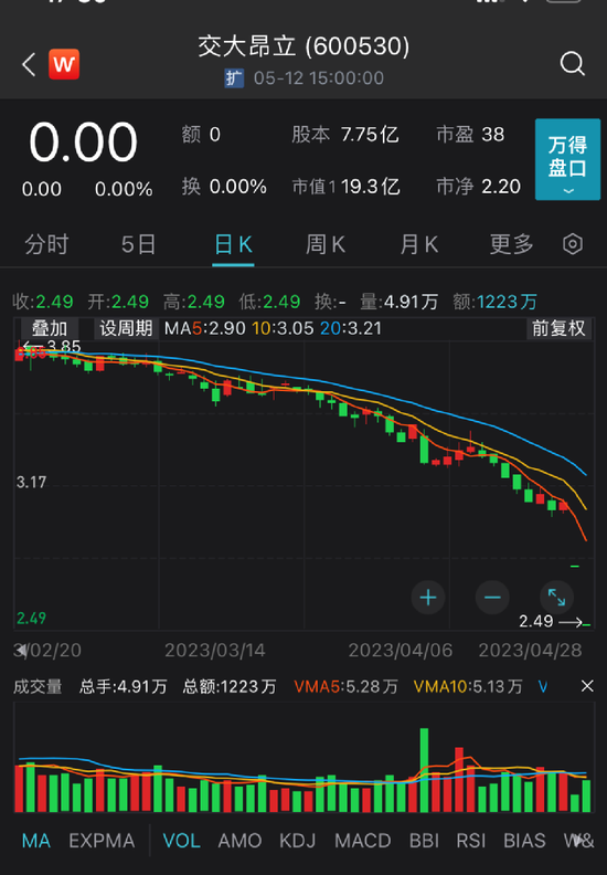 股价方面,由于因无法在法定期限内披露经审计的2022年年度报告及2023年第一季度报告,根据的相关规定,该公司股票已于2023年5月4日起停牌。停牌前收报2.49元,年内股价跌超34%,公司市值19.3亿元。