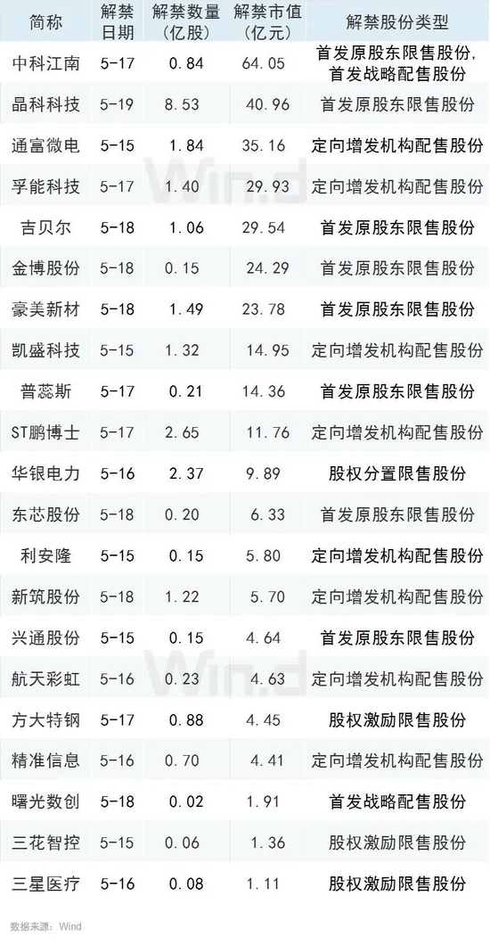 具体个股上看,本周解禁市值最大的是创业板个股中科江南达64.05亿,占比周解禁总量的18.1%,占比较高。紧随其后晶科科技、通富微电等9家解禁市值也较大,均超过10亿元。