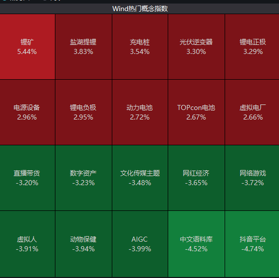 充电桩、虚拟电厂、磷酸铁锂和固态电池等板块领涨。AI概念股全线走低,动漫、影视、知识产权和传媒等板块领跌。新华网跌停,中文在线、唐德影视和值得买均跌超12%,平冶信息、当虹科技和汉仪股份等多股跌超8%。