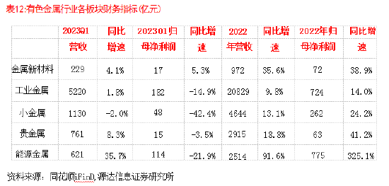 分析有色金属行业各板块的财务指标情况,从营业收入表现来看,能源金属高速增长,2022 年同比增速为91.6%,2023年Q1 同比增速为35.7%。从归母净利润表现来看,2022年能 源金属高速增长,同比增长325.1%,2023年 Q1 仅金属新材料板块实现增长,同比增速为5.3%。