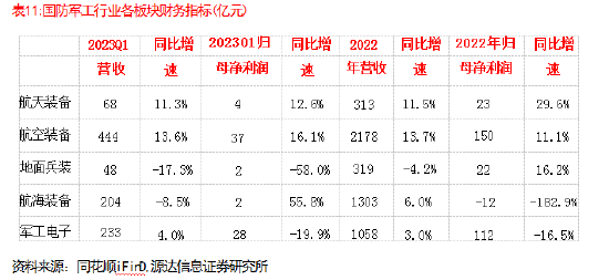 分析国防军工行业各板块的财务指标情况,从营业收入表现来看,航空装备和航天装备的增 速较快,2022年同比增速分别为13.7%和11.5%,2023年 Q1 同比增速分别为13.6%和 11.3%。从归母净利润表现来看,2022年航天装备板块高速增长,同比增长29.6%,2023 年Q1 航海装备板块高速增长,同比增速为55.8%。