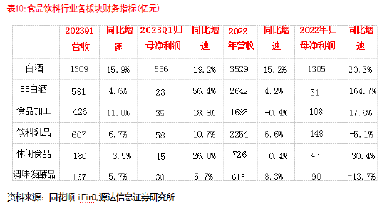分析食品饮料行业各板块的财务指标情况,从营业收入表现来看,2022年白酒板块的增速 较快,同比增速为15.2%,2023年 Q1 白酒板块和食品加工板块增速较快,同比增速分别 为15.9%和11.0%。从归母净利润表现来看,2022年白酒板块增速较快,同比增长15.2%, 2023年Q1 非白酒板块高速增长,同比增速为56.4%。