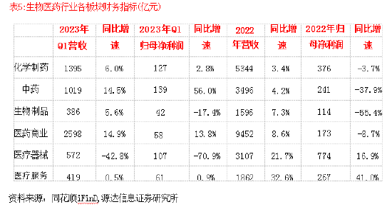分析生物医药行业各板块的财务指标情况,从营业收入表现来看,2022年医疗服务和医疗 器械的营业收入增速较快,2022年同比增速分别为32.6%和21.7%,2023年Q1 医药商业 和中药的营业收入增速较快,同比增速分别为14.9%和14.5%。从归母净利润表现来看, 2022年医疗服务和医疗器械增速较快,同比增速分别为41.0%和16.9%;2023年Q1 中药 和医药商业增速较快,同比增速分别为56.0和13.8%。