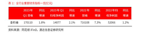 随着各地疫情防控的有序放开,我国经济开始缓慢复苏。2022年全行业实现营业收入71.6 万亿元,同比增长7.3%,实现归母净利润5.2万亿元,同比增长1.2%;2023年一季度实 现营业收入17.0万亿元,同比增长1.8%,实现归母净利润1.5万亿元,同比增长2.1%。