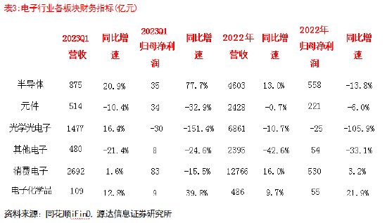 分析电子行业各板块的财务指标情况,从营业收入表现来看,2022年半导体、消费电子和 电子化学品的营业收入保持正增长,分别为13.0%、16.0%和9.7%;2023Q1 仅消费电子 的营业收入保持正增长,同比增速为1.6%。从归母净利润表现来看,2022年电子化学品归 母净利润增速较快,同比增速为21.9%;2023Q1 电子行业所有板块同比表现不佳,皆为负增长。