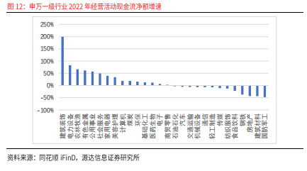 建筑装饰和电力设备自我造血能力增强,国防军工、建筑材料和房地产自我造血能力下滑。 经营活动现金流净额能够反映企业的自我造血能力。从2022年申万一级行业的经营活动现 金流净额增速情况来看,建筑装饰和电力设备行业增幅居前,分别增长199.2%和83.0%。 国防军工、建筑材料和房地产行业降幅居前,增速分别为-47.6%、 -43.7%和-43.2%