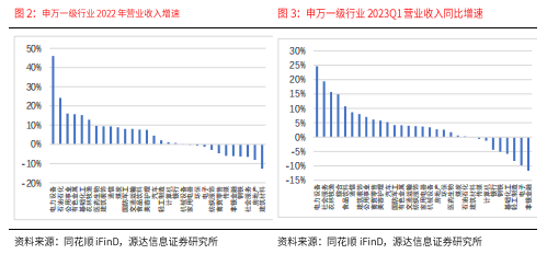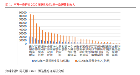 从申万一级行业2022年报和2023年一季报营业收入的总量来看,建筑装饰、石油石化、 银行、交通运输和非银金融排在首位,主要系这些行业包含体量较大的“中字头”公司,与 国民的经济息息相关,体量占比较大。
