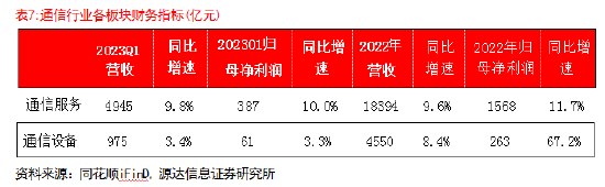 分析通信行业各板块的财务指标情况,从营业收入表现来看,2022年通信服务和通信设备 同比增速分别为9 .6%和3 .3%,2023年 Q1 同比增速分别为9.8%和3.4%。从归母净利润 表现来看,2022年通信服务和通信设备同比增速分别为11.7%和67.2%,2023年Q1同比增速分别为10.0%和3.3%。