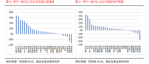 全 A 行业扩产意愿略有回暖,建筑材料、电子、电力设备和汽车行业的增速居前。在建工 程和固定资产的变化在一定程度上反映了行业的扩产意愿和景气度。 一般来说,行业需求会 促使公司积极扩产。结合2022年在建工程和固定资产的增速情况,建筑材料、电子、电力 设备和汽车行业的增速居前,行业扩产意愿和速度较快。家用电器行业的在建工程和固定资产增速分别为-33.1%和-26.9%,降幅较大。