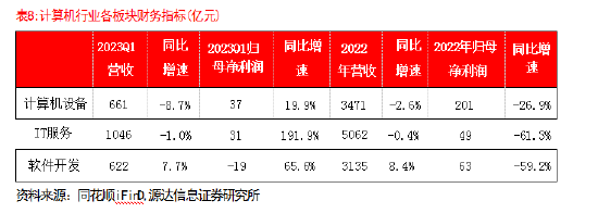 分析计算机行业各板块的财务指标情况,从营业收入表现来看,仅软件开发的营业收入正增 长,2022年同比增速为7.7%,2023年 Q1 同比增速为8.4%。从归母净利润表现来看, 2022年各板块均为负增长,2023年一季度IT 服务板块高速增长,同比增速为191.9%。