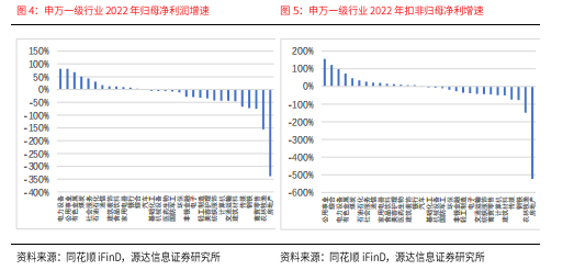 2022 年申万一级行业的归母净利润增速和扣非归母净利增速基本与营业收入增速保持一 致。1)受益于营业收入高增长,电力设备行业利润增速较快,2022年归母净利润增长81.4%, 扣非归母净利增长156 .3%,2023年一季报归母净利润增长31 .5%,扣非归母净利增长 24.8%;此外公用事业、有色金属、煤炭和石油石化行业的归母净利润增速和扣非归母净利 增速均居行业前列。2)房地产行业利润降幅居前,其中归母净利润增速为-338.6%,扣非归 母净利增速为523.2%;2022年农林牧渔行业归母净利润增速为155.3%,扣非归母净利增 速为149.0%,主要系生猪和鸡肉价格低迷,公司盈利下滑等原因。