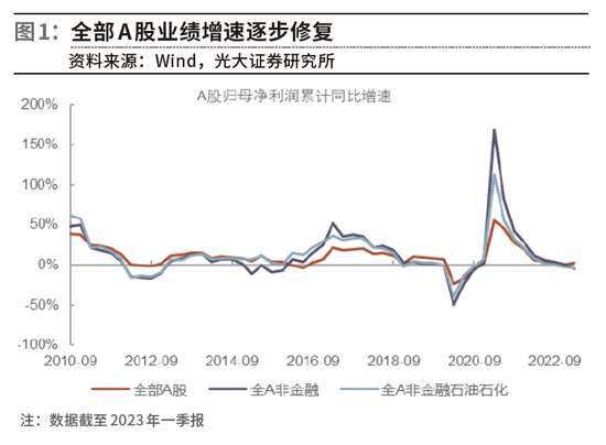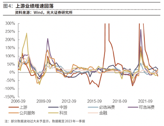 瑞银证券表示,从整体情况来看,2023年一季度上市公司盈利或为全年低点。全部A股盈利在2023年一季度小幅增长3%,但剔除金融后同比下滑5%,显示出疫情后整体的经济复苏并非一帆风顺。银行板块的盈利在一季度仅同比微增2%,但非银金融板块受益于股市的回暖在一季度录得76%的盈利同比增长,推动金融板块的总体盈利在一季度同比上涨11%。与此同时,由于中上游材料价格在一季度维持相对高位,中下游行业的利润率仍面临较大压力。
