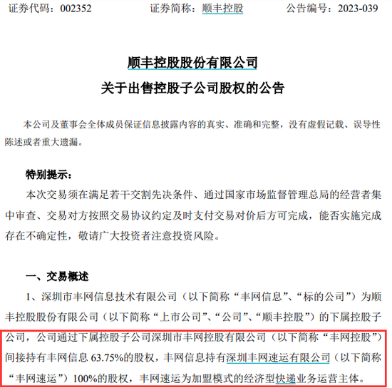 消息面上,5月12日晚间,顺丰控股(002352)突然发布公告称,下属控股子公司深圳市丰网信息技术有限公司与深圳极兔供应链有限公司签署了《股权转让协议》,丰网控股拟以11.83亿元转让深圳丰网速运有限公司(以下简称:丰网速运)100%的股权。