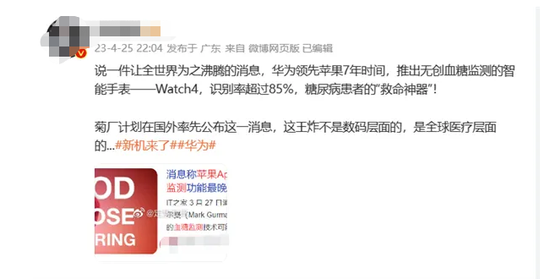 据悉,这将是全球第一款支持血糖监控的智能手表,苹果也在无创血糖方面深耕数年,至今依然未见到产品亮相,甚至还被爆料也推迟数年——国外媒体人马克?古尔曼认为,苹果的无创血糖产品“至少还需要三到七年的时间”。也就是说,华为该技术已领先苹果7年时间。