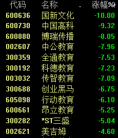 教育板块中,国新文化跌停,中国高科跌超9%。