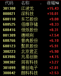 今天上午,芯片概念盘中拉升,其中存储芯片板块涨幅居前,江波龙涨超15%,深科技涨停。