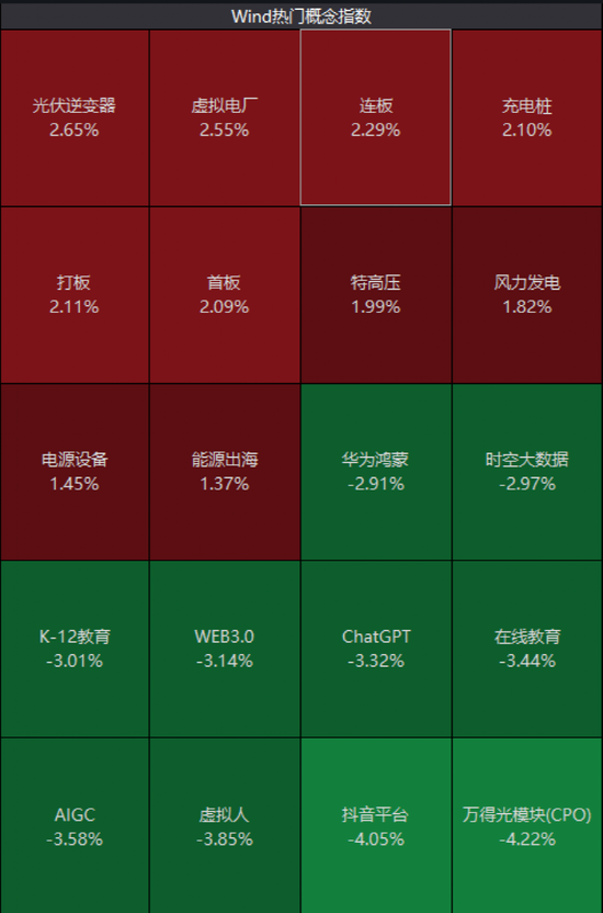 光伏、充电桩、新能源等概念整体走高,光模块、在线教育、AIGC等继续大跌。