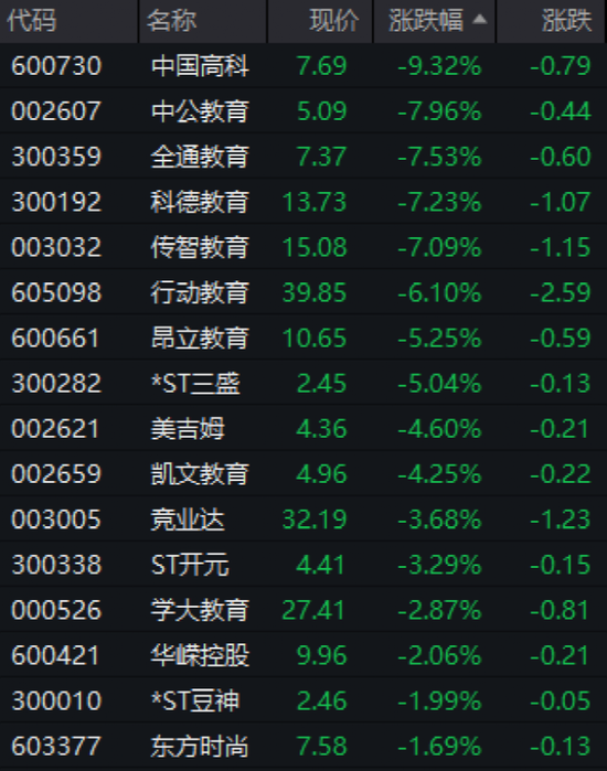 教育板块继续下挫,中国高科一度跌停,中公教育(维权)、全通教育、科德教育、跌逾7%。