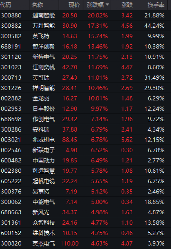 新能源板块继续活跃,虚拟电厂概念股持续走强,万胜智能大涨超17%,安科瑞、恒实科技、中能电气等均涨超5%。