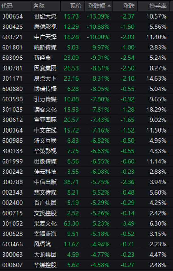 传媒板块快速跳水,世纪天鸿跌超13%,皖新传媒、中广天择等跌停,新经典、易点天下、引力传媒均大跌超6%。