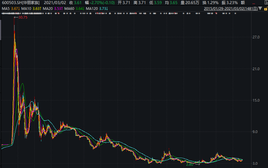 华丽家族在2015年的股价最高达30.75元,随后不断下跌,已经沦为2元股多年,泽熙系持股市值已跌至2亿元。