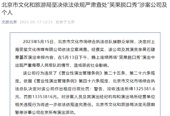 今天中午,据文旅北京微信公众号消息,2023年5月15日,北京市文化市场综合执法总队接群众举报,决定对上海笑笙文化传媒有限公司依法立案调查。经查实,该公司及其演员李昊石肆意篡改演出申报内容,在5月13日下午、晚上连续两场“笑果脱口秀”演出中出现严重侮辱人民军队的情节,造成恶劣社会影响。