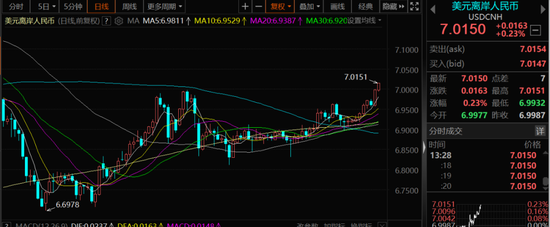 回到市场层面,人民币近期持续杀跌在一定程度上影响了权益市场的走势。近7个交易日,离岸人民币已经杀跌近千点。今天,美元兑离岸人民币已经突破了7这个重要关口。A股市场亦跟随继续杀跌。