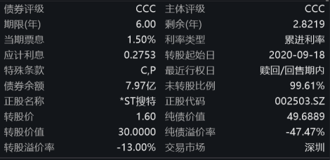 由于无退市整理期,搜特转债很可能在蓝盾转债之前退市,成为可转债历史上第一只被强制退市的可转债。