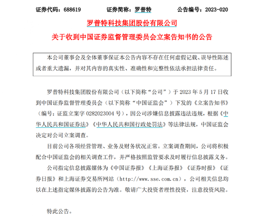 5月17日,罗普特发布公告称,公司收到中国证券监督管理委员会(以下简称“中国证监会”)下发的《立案告知书》(编号:证监立案字0282023004号),因公司涉嫌信息披露违法违规,根据《中华人民共和国证券法》《中华人民共和国行政处罚法》等法律法规,中国证监会决定对公司立案调查。