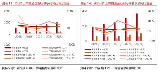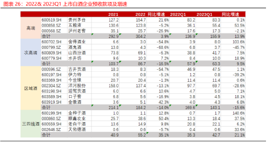 分领域来看,2022 年收入增速:次高端(24.7%)>高端(15.4%)>区域酒(11.0%)> 三四线酒(-13.2%);2022 年归母净利增速:次高端(39.2%)>区域酒(20.2%)>高 端(19.1%)>三四线酒(-120%);2023Q1 收入增速:区域酒(22.5%)>高端 (16.5%)>次高端(6.4%)>三四线酒(4.8%);2023Q1 归母净利增速:区域酒 (21.0%)>高端(16.5%)>次高端(14.1%)>三四线酒(-0.2%)。