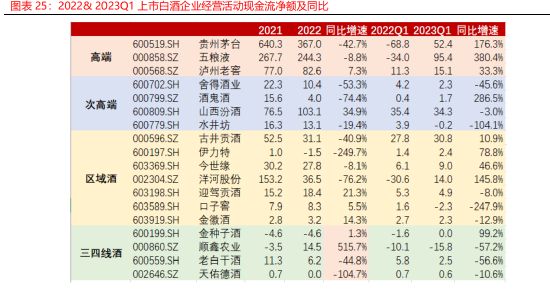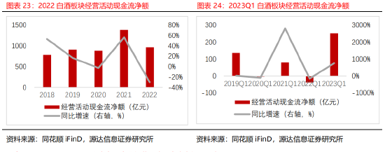 2022,上市白酒企业经营活动现金流净额 965.1 亿元,同比减少 30.3% 。2023Q1,上市白酒企业经营活动现金流净额 251.3 亿元,同比增长 755.4%。18 家上市企业中,有 11 家在 2022 年都出现了经营活动现金流净额的下滑,山西汾酒和顺鑫农业有较大的增幅, 其中山西汾酒增幅达 34.9%,顺鑫农业增幅达 515.7%。受疫情的影响,白酒终端动销减 少,库存压力增大,经销商资金压力大,导致酒企经营活动现金流净额的下降。